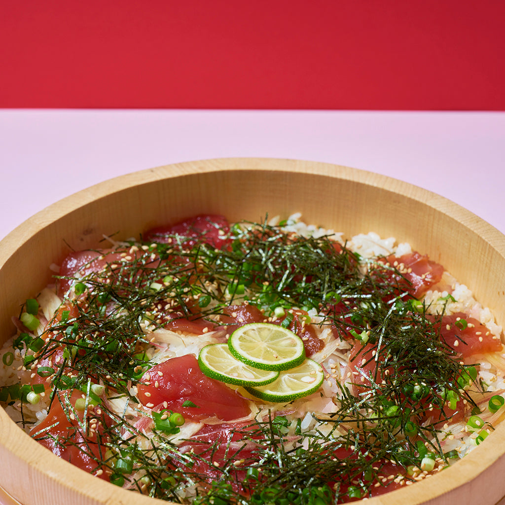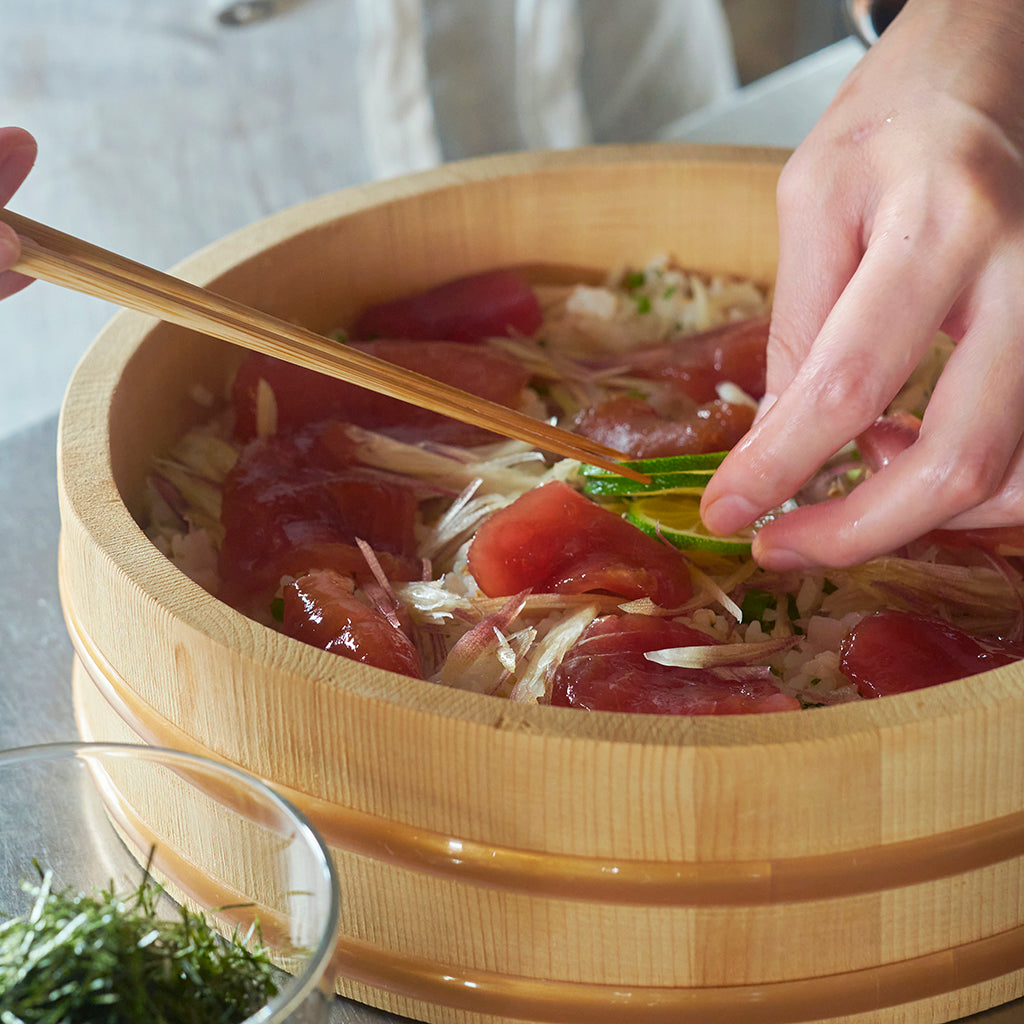 たれに漬け込んだカツオと酢飯がよく合う、三重の郷土料理・手こね寿司。きざみねぎや すだちを添えて、仕上げにたっぷりのきざみのりをかければ、磯の香りが食欲をそそりま す。